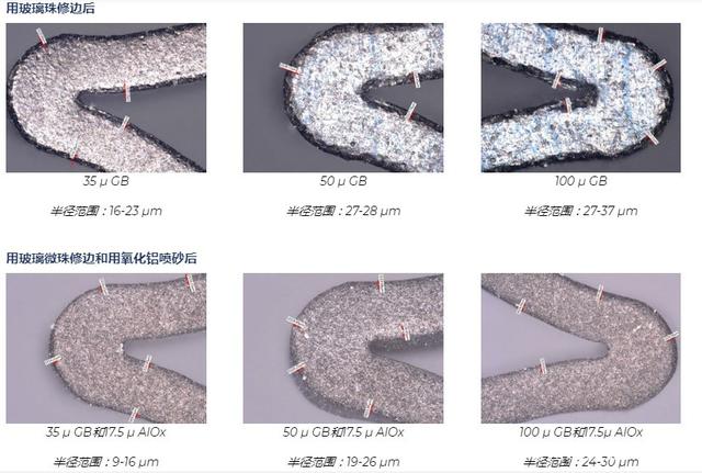 經(jīng)過吉川公司工藝工程師測試,用氧化鋁砂進(jìn)行定向的噴砂處理可以去除氧化層,平滑表面缺陷并改善外圍支架的表面質(zhì)量。支架的受損區(qū)域很脆,但基礎(chǔ)材料鎳鈦諾卻具有延展性。氧化鋁噴砂磨料使用去氧化層,并且對韌性基體的侵蝕最小,從而在支架撐桿的整個長度上形成均勻的表面光潔度。 市場最新的支架設(shè)計和醫(yī)療植入物要求更大的邊緣倒圓角。圓形邊緣降低了被植入物卡住,其他風(fēng)險的可能性。氧化鋁微噴丸的半徑為5-15 m,但新的幾何尺寸指定為接近25 m。該半徑可以通過三種途徑實現(xiàn):延長噴砂周期,使用更大尺寸的氧化鋁或完全使用其他磨料。通過測試,我們了解到更長的噴砂周期可以去除更多的團(tuán)塊,而較大尺寸的氧化鋁會產(chǎn)生過于粗糙而無法拋光的表面。畢竟,氧化鋁顆粒的形狀為塊狀,邊緣稍尖。這給了我們一個可行的選擇:嘗試使用其他類型的磨料。為了克服這一障礙,我們測試了幾種類型的介質(zhì),發(fā)現(xiàn)用玻璃珠噴砂可以在拐角處形成所需的半徑(最大30 m),而不會除去設(shè)備的額外質(zhì)量。結(jié)果是氧化鋁的質(zhì)量提高了十倍。經(jīng)過吉川公司工藝工程師的測試事實說明了結(jié)果的差異。用氧化鋁噴砂處理過的樣品的半徑僅為8-13 m,而用玻璃珠噴砂處理過的樣品的半徑為24-30 m。 經(jīng)過吉川公司工藝工程師最終測試事實證明,最好的心臟支架噴砂工藝需要用氧化鋁砂粗噴砂、再用玻璃珠微噴砂是目前最好的一種噴砂工藝方式。 經(jīng)過粗噴、微噴的產(chǎn)品外徑和內(nèi)徑轉(zhuǎn)角處的半徑可以實現(xiàn),而所需的附加材料去除最少。半徑的大小可以有效地控制,因為它是基于圓形磨料,玻璃珠的大小和速度的??梢钥刂凭哂懈郊影霃降闹Ъ軈^(qū)域。通過機(jī)械加工表面,有助于保持支架的疲勞壽命。玻璃珠磨料通常用于必須保持嚴(yán)格公差的噴丸處理應(yīng)用中。玻璃珠對支架表面進(jìn)行噴丸處理,不會去除任何材料或數(shù)量可忽略不計的材料。如下所示,玻璃珠的尺寸很重要。玻璃珠的尺寸越大;邊緣越圓。玻璃珠有35 ,50 和100 兩種。讓我們看一下使用每種尺寸的樣本測試的結(jié)果。此處顯示的未噴砂的支架表面(500x)邊緣鋒利,并受到制造損壞。半徑范圍僅為3-8 m。為什么用兩種磨料處理比單獨(dú)用氧化鋁處理好? 玻璃珠無法消除制造過程中產(chǎn)生的浮渣,回彈和其他損壞;只有氧化鋁可以。氧化鋁不能產(chǎn)生真正的圓形邊緣。但是,它確實可以提供電拋光所需的理想表面光潔度。一個不能替代另一個。通過使用多步驟過程,植入物表面可以使用經(jīng)過驗證的相同設(shè)備獲得兩全其美的效果。在該過程中添加第二種研磨劑聽起來可能需要更多的勞動力,但實際上比其他修邊過程更有效。例如,電拋光可以產(chǎn)生較大的半徑,但它也會從整個零件中去除過多的材料,而不僅僅是角部,從而損害了支架的疲勞壽命。